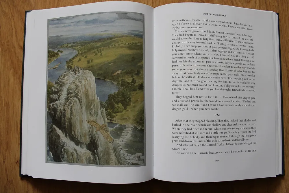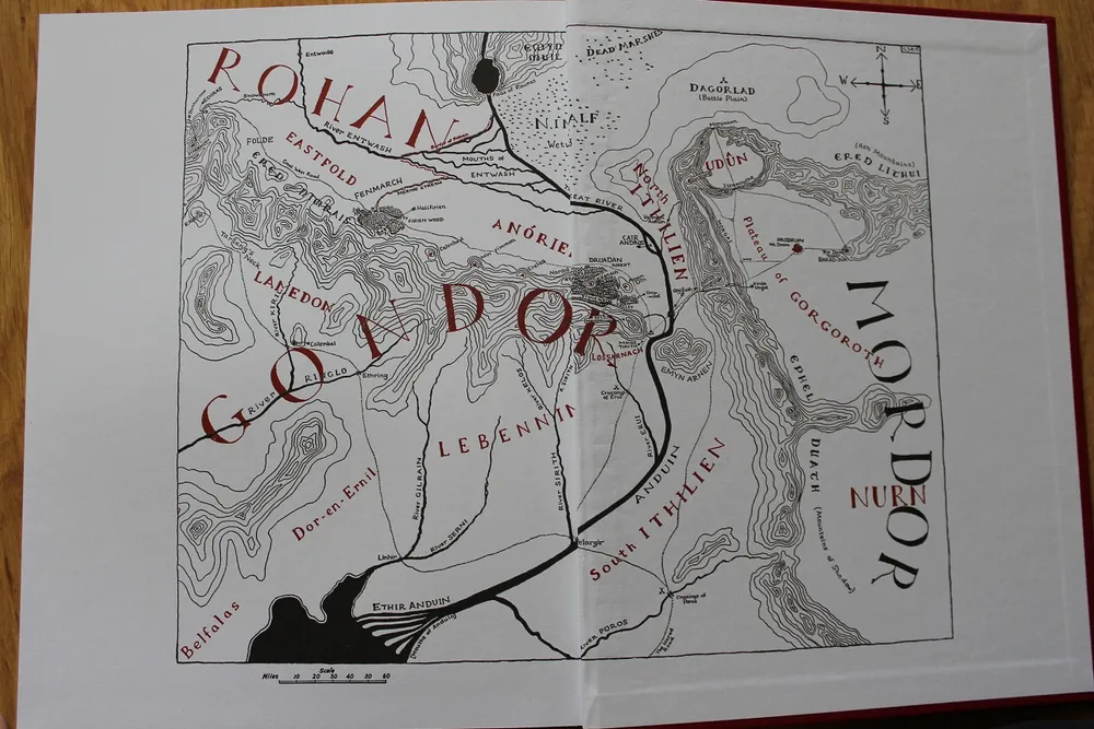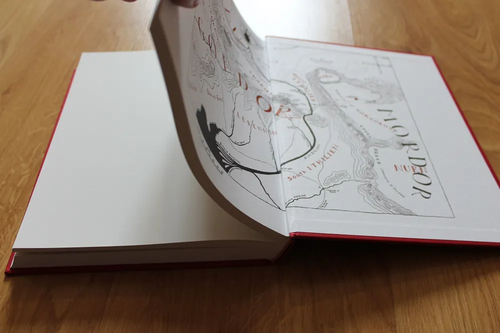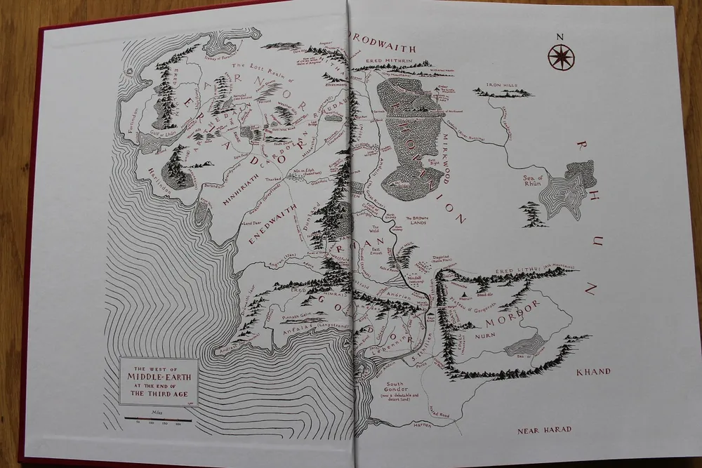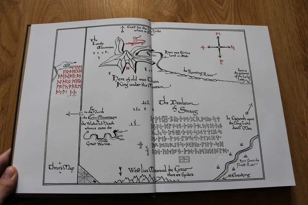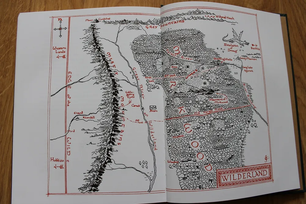 В начале находится замечательно отрисованная карта, на которую в самом тексте есть отсылка(примерно так: "Торин развернул карту своего отца(открой начало книги, что бы найти её)"), герои говорят о красных отметках, рунах и т.д. - всё соответствует нарисованному. Этим самым достигается сильный эффект причастности. :)