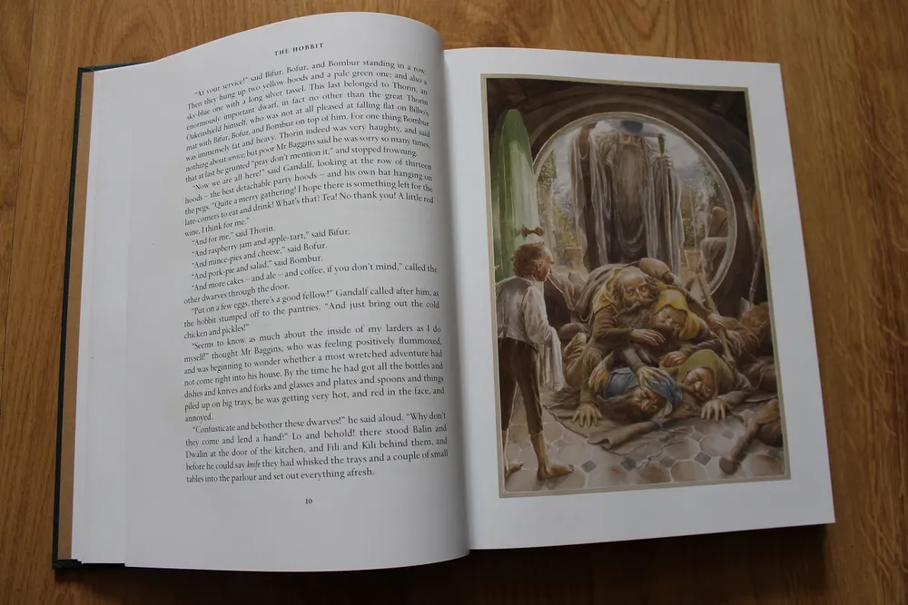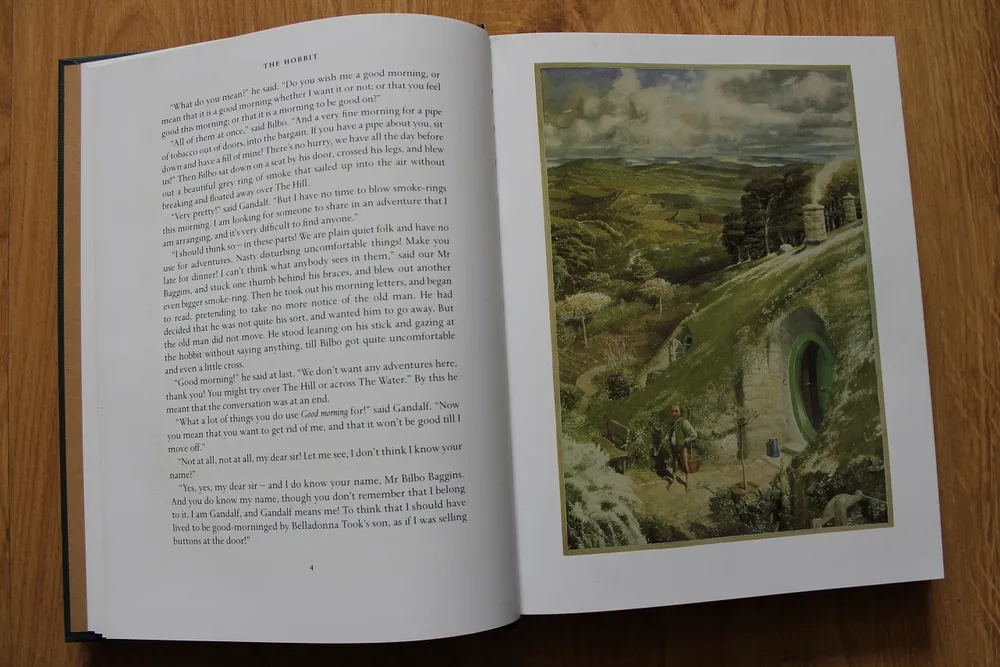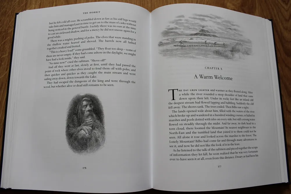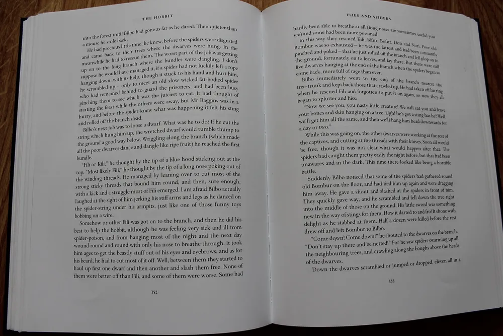 Следом за обложкой нас встречает плотная бумага слегка коричневого цвета, и уже за ней идет само произведение. Страницы у Хоббита плотные, слегка глянцевые с четко пропечатанными буквами. Листать и читать очень приятно. :)