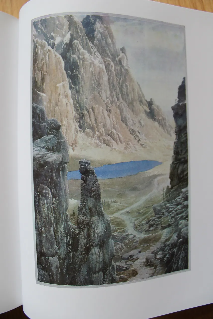 Далее, по мере прочтения, довольно часто встречаются очень красивые и атмосферные иллюстрации, каждая из которых находится на своем месте и соответствует определенному эпизоду(ниже я разместил несколько, но не все). В конце книги нас ждет полная карта мест путешествия наших героев, на которой красными линиями выделен путь туда и обратно. Нарисованы они замечательным иллюстратором Аланом Ли, который, кстати, до сих пор жив и помогает с дизайном новых фильмов от Питера Джексона. (The Hobbit)