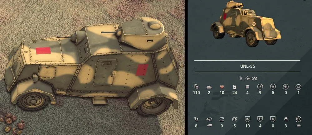 В отличие от ставшего притчей во языцех Бильбао, УНЛ-35 является намного более грозным оружием. В нём отчётливо просматривается советская школа дизайна бронетехники. Эффективность этой бронемашины в бою вполне достаточная и в некотором роде она даже превосходит sdkfz 221, имеющий более скромное вооружение. Потенциально хорошая цель для захвата и последующего использования на поле боя в качестве трофейной техники.