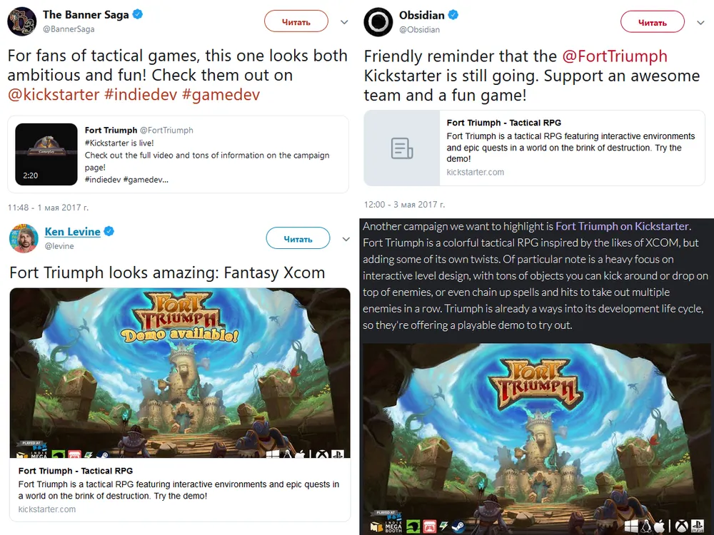 Готовящаяся к выходу в апреле 2019 года Fort Triumph прошла «медные трубы» (Steam GreenLight) в 2016 году, собрала почти 79 тыс. долларов на Кикстартере в 2017 году, теперь игру и группу разработчиков ожидает последнее испытание – выпуск в отличном состоянии из раннего доступа собственной игры Fort Triumph. В игре существуют заклинания, артефакты, двуслойный геймплей – присутствуют как глобальная, так и тактическая карты; герои растут в уровнях, игровое окружение можно использовать в своих целях.