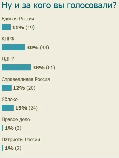 Целых 30% было отдано КПРФ, 15% было отдано Яблоку, 12% Справедливой России и 2% разделили Патриоты России и Правое Дело.
