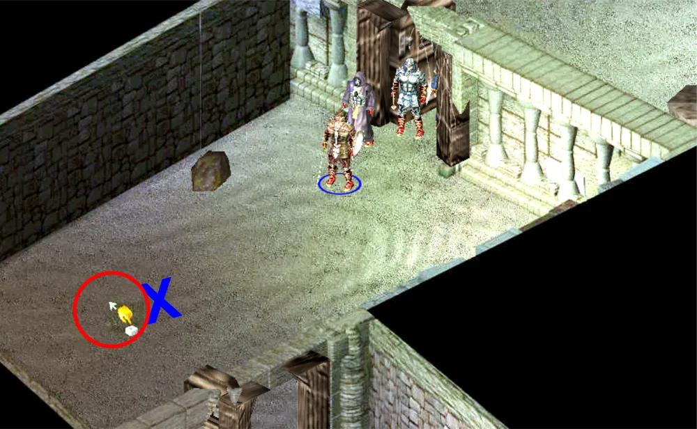24. Колодец судеб. Перейдя через мост, в этом месте вы обнаружите колодец судеб. К западу от него находятся многочисленный отряд сил культа, с которым вам предстоит сразиться. Опустите Камень судьбы в колодец судеб, и тогда оживут четыре голема, которые станут сражаться с культистами на вашей стороне. Игра будет позиционировать их, как ваших врагов, но в первую очередь големы нападут на солдат культа. Скорее всего, после того, как все культисты будут уничтожены, вам придется драться и с големами, поскольку в их задачу входит оборона прохода от всех. Следует иметь в виду, что магия на големов не действует, поэтому перед схваткой вооружите своих магов пращами.