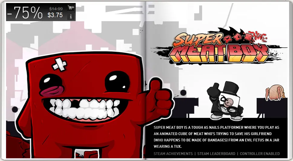 Ситуация такова, что сейчас, как всем известно, идет обдираловка наших кошельков в Стим. И в сегодняшних "Ежедневных сделках" имеется великолепный Super Meat Boy за 3,75 у.е.