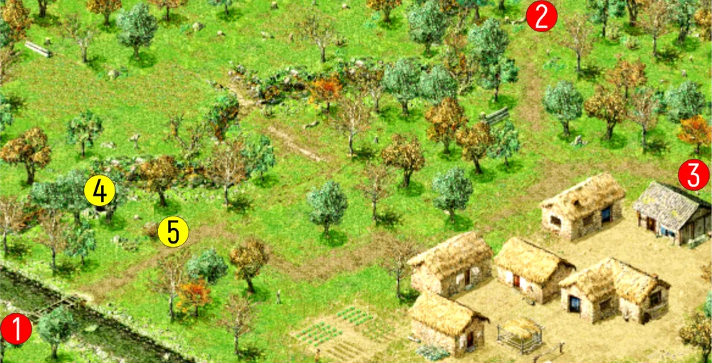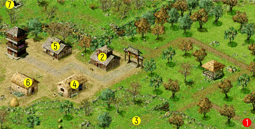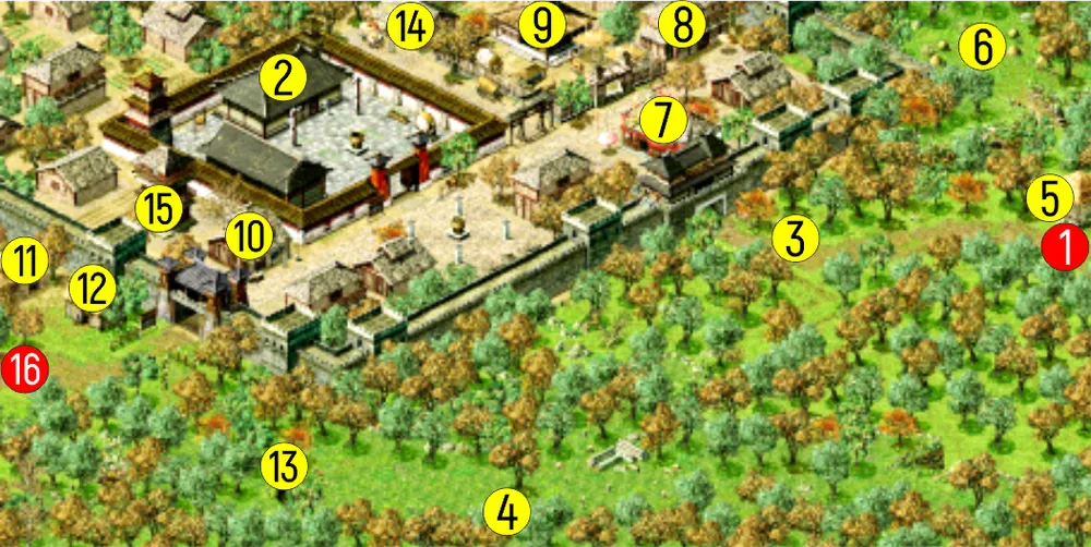 1 – переход в уезд Фэнсян. 2 – штаб командующего. 3 – пастушок. 4 – вожак огров (появится после знакомства с пастушком). 5 – Вэй Цин. 6 – кладбище. 7 – большая таверна. 8 – малая таверна. 9 – курьерская станция. 10 – кузница. 11 – дом Лю Яна. 12 – дом с тайным ходом. 13 – тайный ход. 14 – лавка. 15 – священная пагода. 16 - переход в Саньчуань.