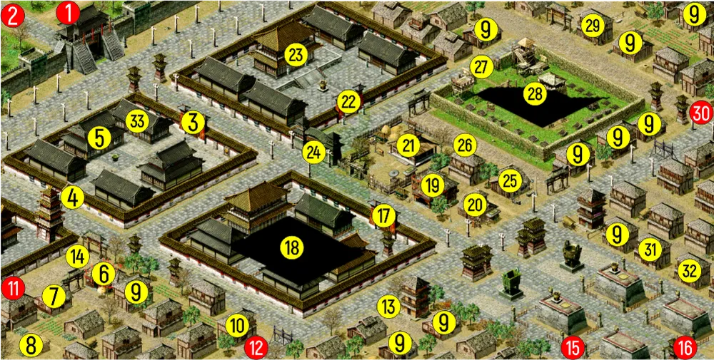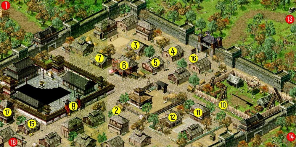 1 – переход в Саньян. 2 – Хоу Сюнь. 3 - дом Сюнь Хо. 4 – дом горожанина. 5 – оружейная лавка. 6 – таверна. 7 – лавка мясника. 8 – ворота поместья командира. 9 – курьерская станция. 10 – ворота казармы. 11 – особняк семьи Цзинь. 12 – боковая комната. 13 – переход в Ханьдань. 14 – переход в Сючэн. 15 – лавка. 16 – Сюнь Хо. 17 – пагода дождевых гусей. 18 – переход в Инчан
