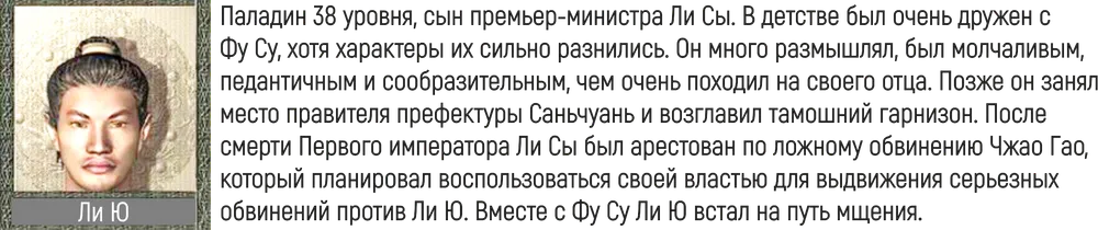Разыскав в резиденции Ли Ю, расскажите ему обо всем, что вы знаете. Когда вы покажете ему письмо Чжао Гао, Ли Ю поймет, что Чжао Гао планирует убить его отца и решит его спасти. Предложите Ли Ю объявить его погибшим при помощи Лю Бана, который сейчас штурмует Саньчуань. Повстанцы разнесут слух, что Ли Ю убит, и в столице вскоре узнают об этом. Ли Ю согласится с вашим планом и скажет, что станет готовиться к поездке в Саньян, где он будет ждать вас в таверне.