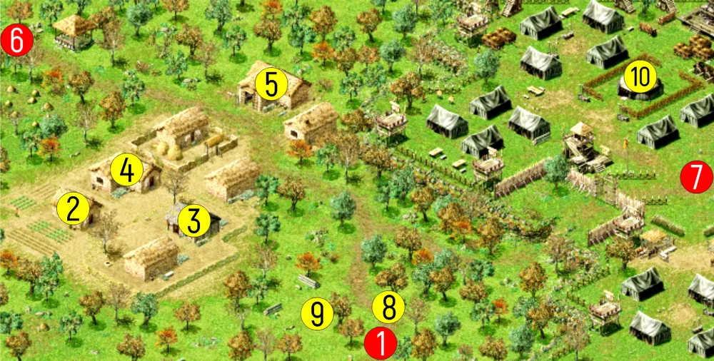 1 – переход в Ханьдань. 2 – дом Цуй Цзю. 3 – дом Чжан Саня. 4 – дом Мо Хуна. 5 – таверна. 6 – переход в Янчэн. 7 – переход в уезд Пэйсань. 8 – Сыма Синь. 9 – отряд солдат Цинь. 10 – шатер командующего.