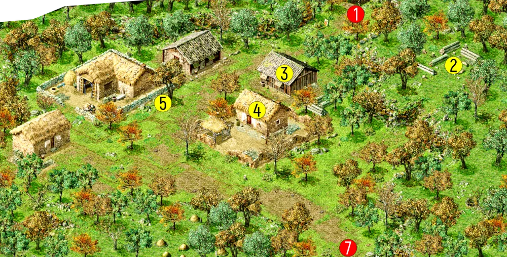 1 – переход в Яньсан. 2 – логово разбойников. 3 – дом Сяоли. 4 – дом Лу Пина. 5 – охотник. 6 – дом старика. 7 – переход в деревню Хэцзян.