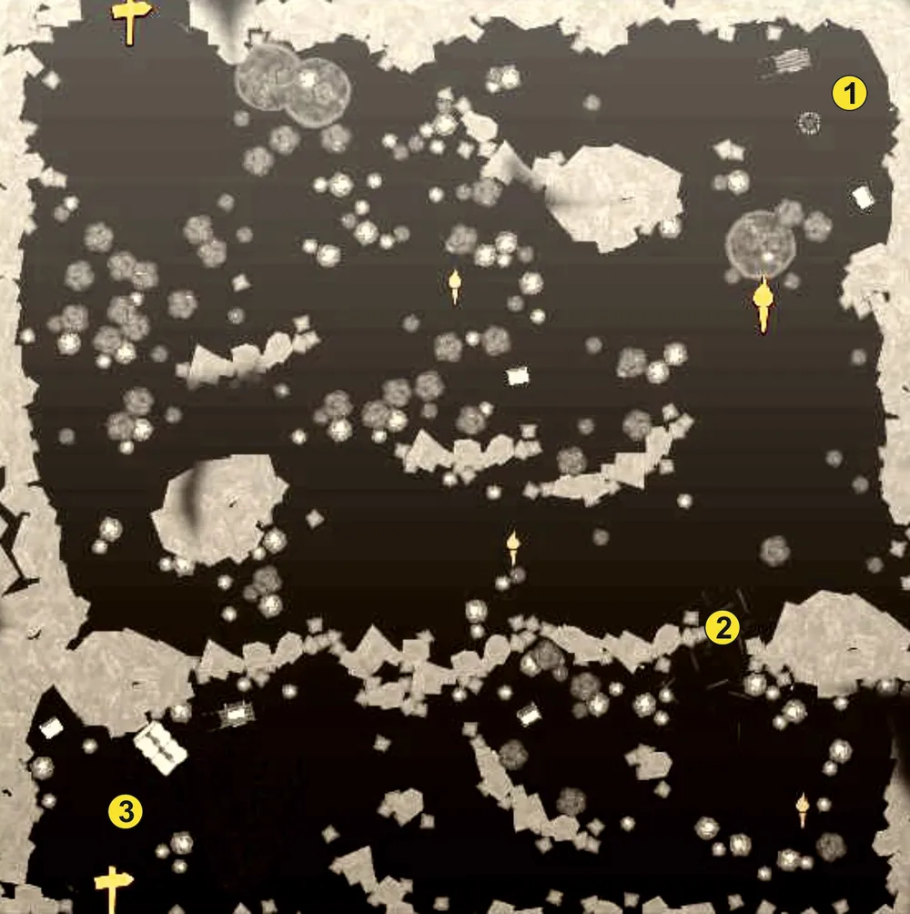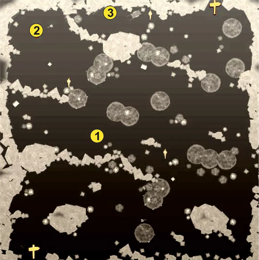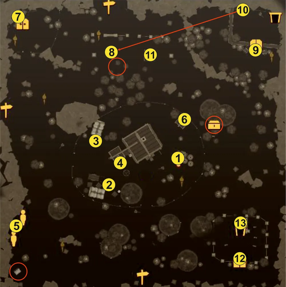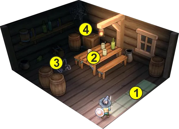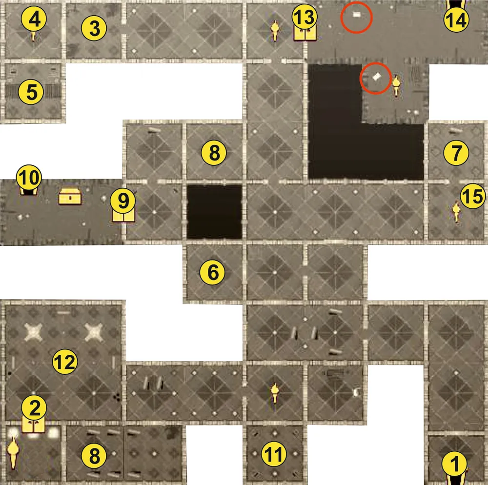 1 – выход на кладбище. 2 – юго-западная дверь. 3 –растение-хищник. 4 – каменные кубы. 5 – два рычага. 6 – желтые шары. 7 – пьедесталы с углублениями. 8 – морозный туман. 9 – западная дверь. 10 – вход в кладовую таверны. 11 – южные рычаги. 12 – гробовщик. 13 – северная дверь. 14 – выход во двор таверны. 15 – красный дурман.