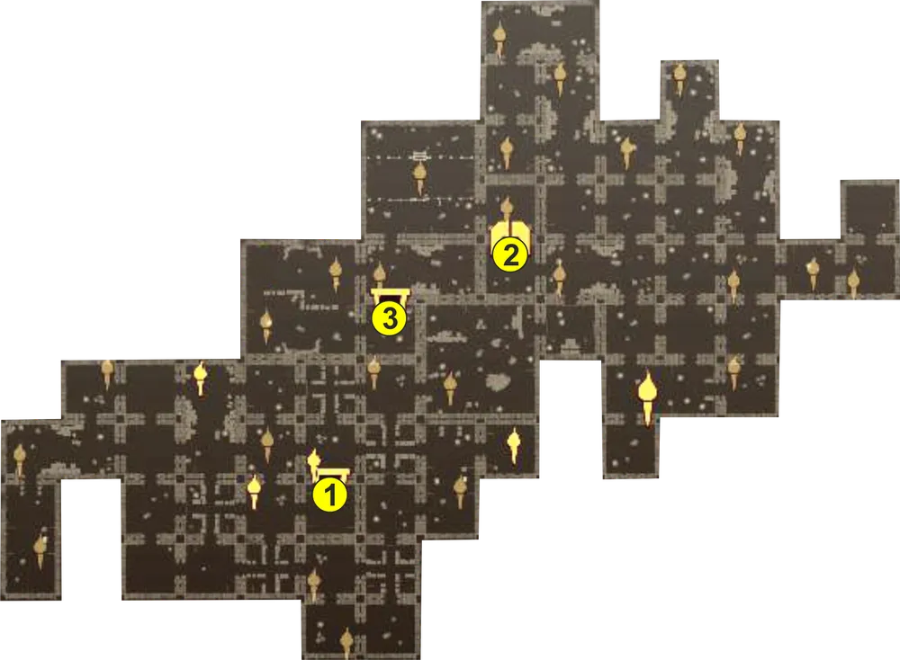 1 – вход в проход. 2 – запертая дверь (нужен серебряный ключ). 3 – выход из прохода.