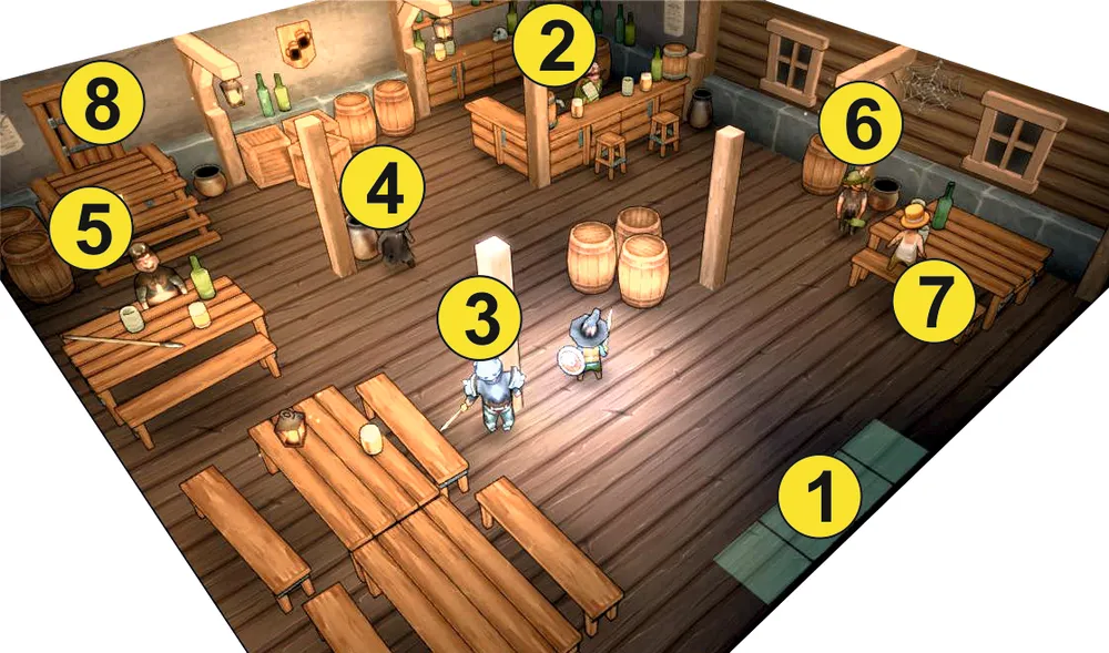 1 – выход из таверны. 2 – Хмуронос Серый. 3 – солдат короля. 4 – Ловкие Ручки 5 – Торин. 6 – Борин. 7 – торговец. 8 – вход в кладовую.