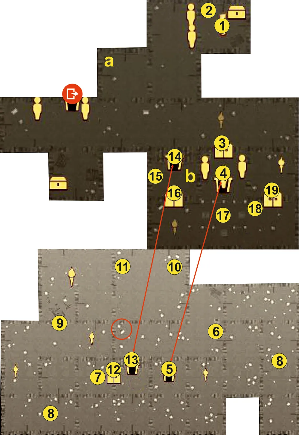 1 – жрец. 2 – рычаг. 3 – решетка. 4 – колодец. 5 – место спуска. 6 – рычаг. 7 – хранилище TNT. 8 – морозный туман. 9 – завал. 10 – гигантский носатик. 11 – рычаг. 12 – ворота. 13 – выход из жуткого колодца. 14 – вход в жуткий колодец. 15 – рычаг. 16 – ворота. 17 – реликвия. 18 – рычаг. 19 – ворота. a,b – магические кубы.