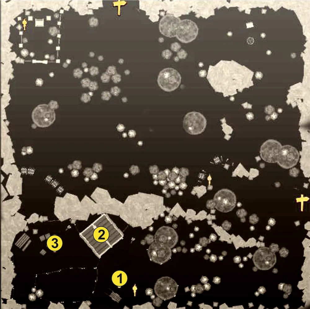 1 – бочка с TNT. 2 – завал. 3 – лагерь Дубины.