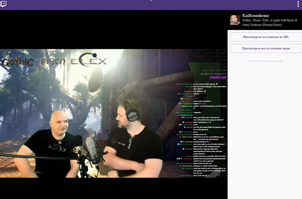 Кадр из трансляции на twitch-канале Кая Розенкранца (композитора, писавшего музыку к серии Gothic), состоявшейся 3 июня 2018 года, на которой обсуждалось возобновление работы Pyrahna Bytes над серией Gothic. Руководитель проекта Бьорн Панкрац из Pyrahna Bytes (слева) и Кай Розенкранц (справа)