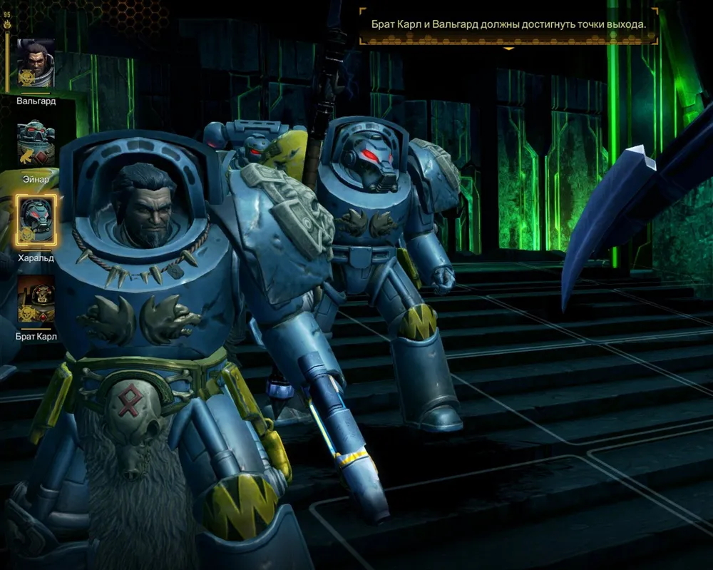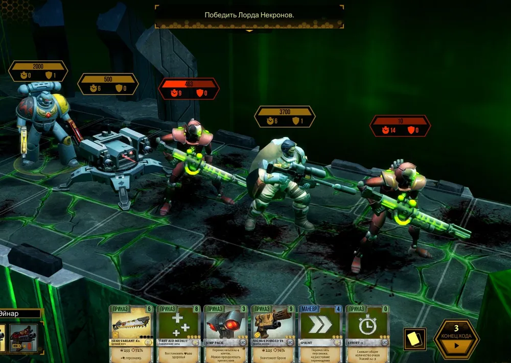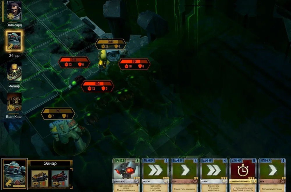 Перезарядка оружия – не такое простое дело, как может показаться. У Харальда всего одна возможность перезарядить пистолет, придётся сбросить много карт и пропустить достаточное количество ходов. Такая же проблема с перезарядкой оружия у Эйнара с той разницей, что ему необходимо перезаряжать два ствола. Брату Карлу перезарядка не нужна, но лучше, чтобы в его арсенале наготове были три-четыре мелтагана. В общем, уйдёт много времени: хорошо, что враги в этой миссии не появляются непрерывно, как в «Духе Машины».