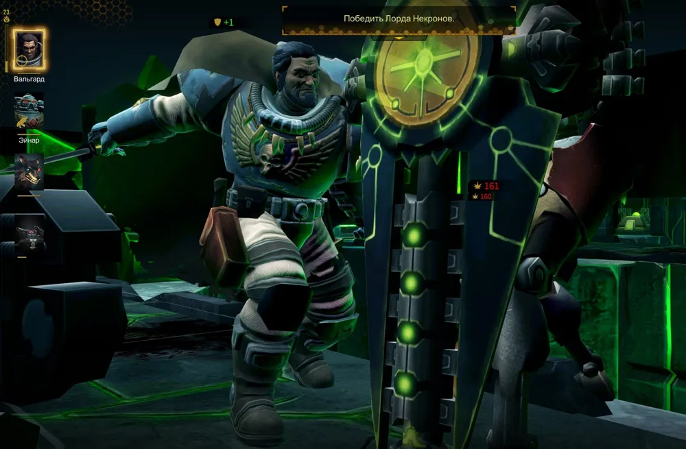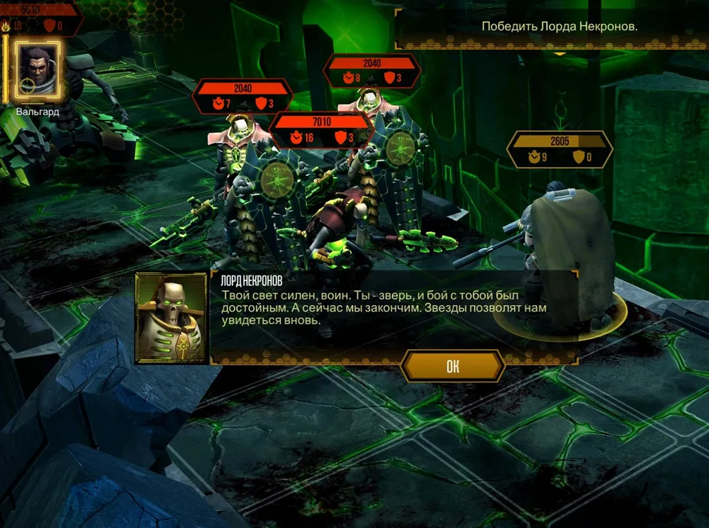 Вальгард остался один, без патронов, с пустой винтовкой и двумя картами. Тут к месту боя подоспел летающий босс, шарахнул из своей немаленькой пушки и зацепил главнокомандующего некронов! Удар ножа – последнее оружие! – победа.