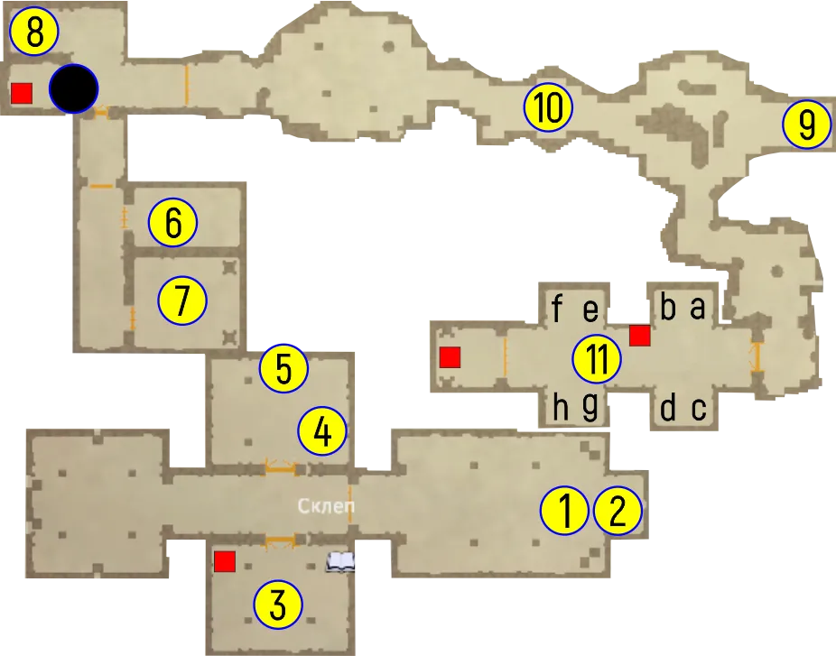 1 – телепорт (перемещение на поверхность). 2 – Кармелла. 3 – библиотека. 4 – торговец. 5 – телепорт (перемещает в таверну призраков). 6 – место падения из туалета. 7 – рычаг, отключающий газ.8, 9 – лестница (подъем на поверхность). 10 – археологическая экспедиция. 11 – залы загадок.