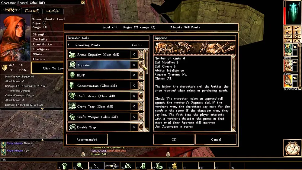 Ветераны ночей невервинтера не заметят больших изменений в способностях (feats), но зато навыки (skills - которые прокачиваются) раскроются под другим углом. Вместо простого убеждения здесь аж четыре социальных навыка: дипломатия, обман, угроза, чувство побуждений (эдакая проницательность против вранья), плюс детективный навык «сбор информации», который позволяет вытянуть больше сведений из разговоров. «Выживание» помогает избегать нежелательных встреч в путешествиях на карте мира, а также читать следы (на кой черт нужно чтение следов в боевой RPG?). Медицина больше не позволяет лечить спутников – лишь стабилизировать состояние при потере сознания (персонаж больше не умирает внезапно, а находится при смерти, пока его хиты не достигнут значения «-10» и ниже). С помощью «Spellcraft» волшебник может записывать новые чары, а прежняя суть осталась неизменной – определение заклинаний противников. Барды, используя навык «Выступление», расширил свой репертуар и может исполнять дополнительные песни, которые: