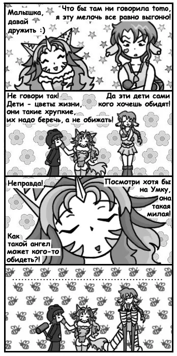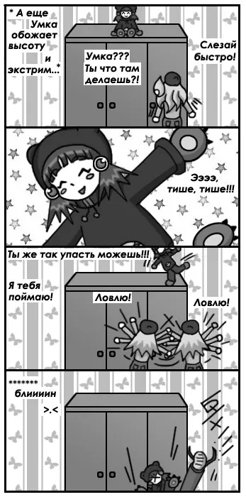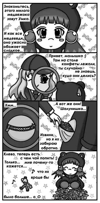 Как и все дети, Умка при первой встрече кажется милым и добрым ангелочком, но кто провел с ней хотя бы день, знает, что этот медвежонок не такой уж и безобидный. Несмотря на свои шалости окружающих она любит, иногда даже слишком сильно =)
