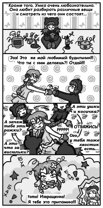 Конечно, все это в основном в шутку, но иногда и от шуток синяки остаются >.< дружелюбна («tomo» - яп. «друг»), умна, не любит конфликтные ситуации. Физически отвечает редко, предпочитает как-нибудь потом отомстить язвительной шуткой. Неплохо (для девушки) разбирается в компьютерах :)