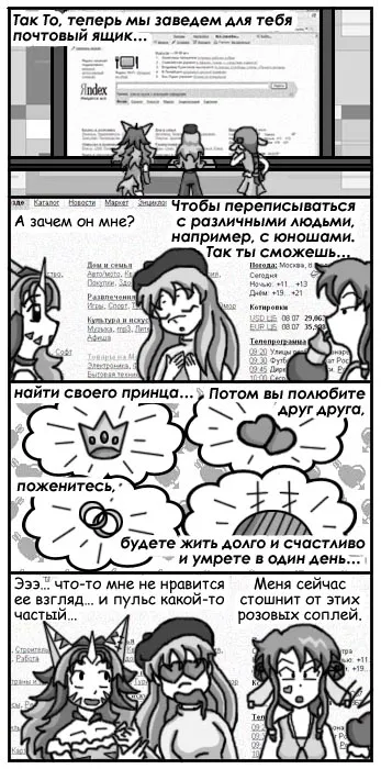 После окончательного осознания нерентабельности самиздатного печатного издания храброй редакцией «АниМирка» была предпринята попытка создания интернет-версии журнала. Который однако не продержался дольше одного номера… Но фанаты проекта TO&HI требовали еще, поэтому в течении 2004-2005 годов серия черно-белых ён-ком (стрипов) была продолжена. Теперь в них прослеживался какой-то общий сюжет и немного расширился круг персонажей.