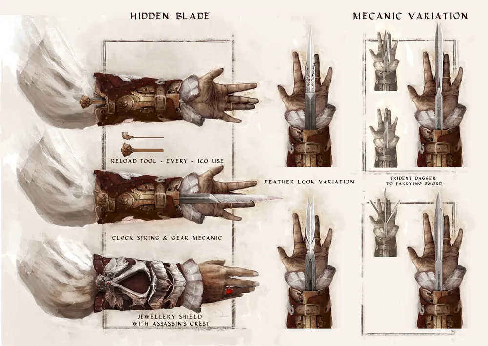 Скрытый клинок представляет из себя наруч с выдвижным лезвием который приводится в действие движением запястья, от которого идет леска обматывающая кольцо на пальце, позже механизм перестал требовать подобную манипуляцию. Сам механизм выдвижки довольно прост, однако из официальных источников, можно узреть лишь конструкцию Эцио. Не нужно быть лауреатом Нобелевской премии, чтобы понять, что конструкция менялась вслед за эпохой. Но увидеть нам ее не суждено. Оно и понятно, ведь придумать действительно работающую, не глупую конструкцию - дело очень не простое. Но если бы это было преподнесено с толком, хотя бы в дизайнерском плане и с оглядкой на эпоху, было бы чудно.