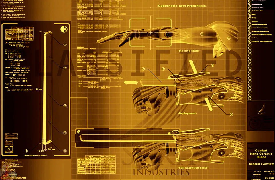 Если и этого мало, то киберпротез имеет возможность являть миру нано-мечи с тыльной стороны запястий, которые в одно мгновение могут прошить насквозь свои цели и тут же исчезнуть, распластав под ногами жертв все гастрономическое содержимое брюшной полости.