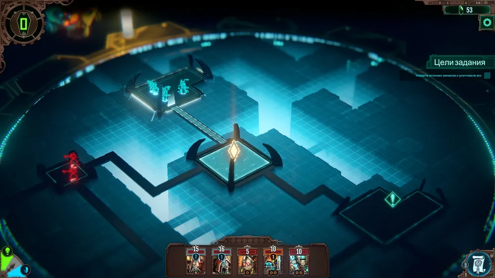 Выбираем миссию, собираем отряд из доступных техножрецов и сервиторов и вперёд. Загружается экран миссии, и мы наблюдаем за отрядом (в игре он называется когортой) сверху. Прорисовывается план данной части гробницы.