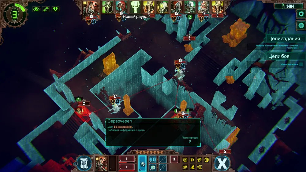 Сервочереп – друг человека механика. Как я говорил выше, каждый жрец оснащён сервочерепом. Череп – используемое «умение», которое восстанавливается через раунд. Изначально он умеет лишь сканировать врага, показывая его здоровье и броню, а также умеет «похищать» 1 ОП из стел и врагов «без сознания». Некоторые классы могут открыть для него новые возможности. Например, забирать все ОП из одной цели, наносить единичку урона, усиливать физическую броню жреца, усиливать солдат.