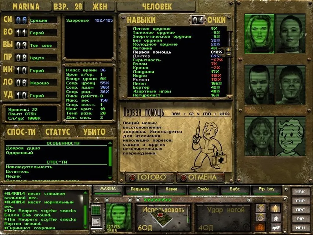 Следующий по ценности навык: «первая помощь». Пользуясь этим навыком, нельзя срастить сломанную конечность, но можно полностью восстановить потерянное здоровье, особенно если раненый не может позволить себе отвлекаться от боя для приема стимуляторов или пищи. Что ещё нам пригодится?