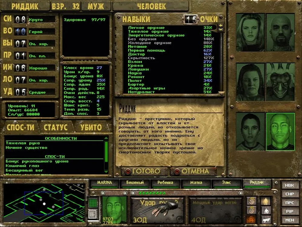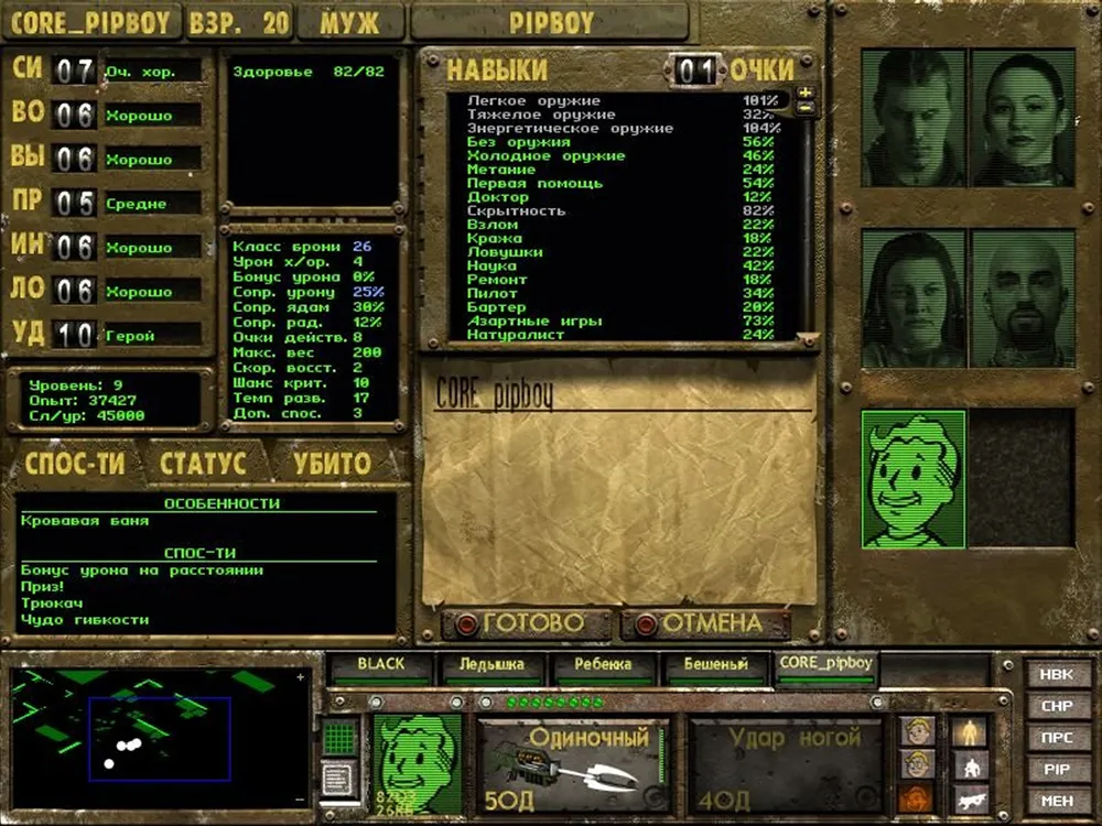 Вот мы и подошли к одной из самых интересных особенностей Fallout Tactics — накоплению очков опыта и навыков. Мастера Fallout 2 наверняка помнят, что попытка отложить навык до появления в колонке выбора чего-либо более интересного заканчивалась его исчезновением через следующие три уровня. Правда, ситуацию можно было исправить, изменив параметры героя с помощью медицинских спецсредств и взяв появившийся нужный навык. В Fallout Tactics трюк с химией не работает, но он и не нужен. Просто не берём навык на 3-м, 6-м, 9-м уровнях. Они не пропадают, а ждут своего часа. Точно так же дело обстоит с очками опыта: они доходят до 99, но не обнуляются, как в Fallout 2, а продолжают накапливаться дальше. Какие преимущества это даёт?