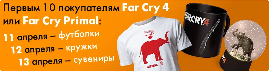 Ежедневно с 11 по 13 апреля мы будем дарить классные сувениры за покупку Far Cry 4 или Far Cry Primal*! Первые 10 человек, честно купившие одну из вышеупомянутых игр (без использования промокодов и других хитростей), гарантированно получат: