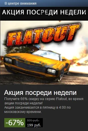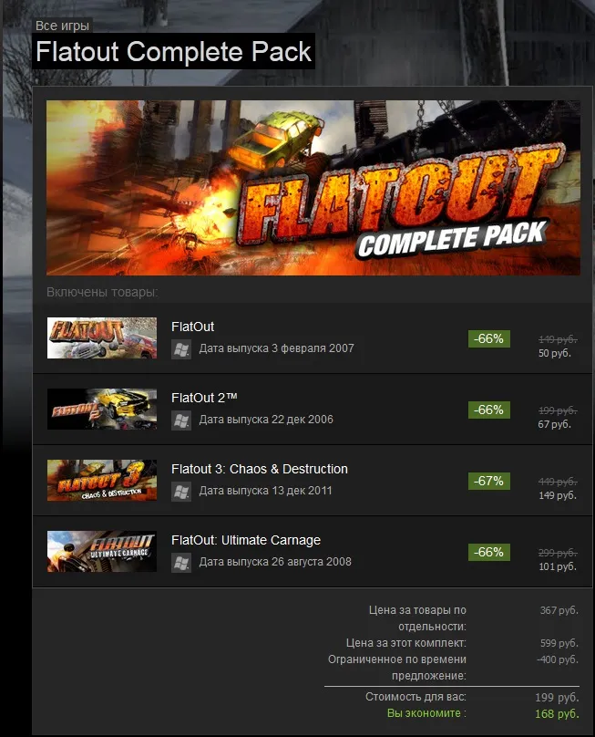 Не упустите шанс приобрести все игры серии FlatOut со скидкой за 199 рублей! Участвуйте в адреналиновых гонках, разрушайте машины и наслаждайтесь захватывающим игровым процессом. Акция действует 26 часов!
