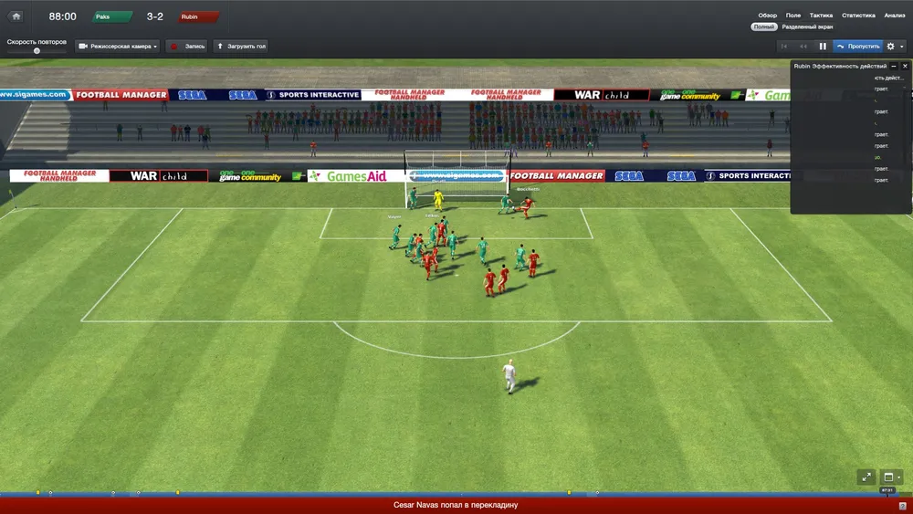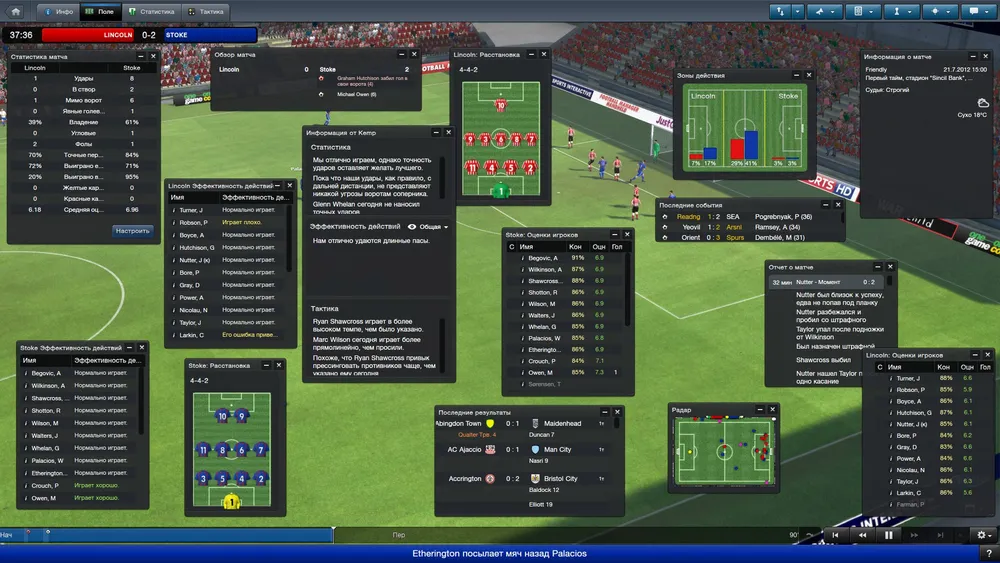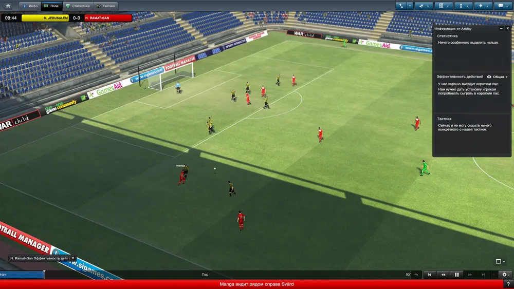 Пластмассовые человечки, слабенькая графика на уровне футбольных симуляторов десятилетней давности, опять же, кучи всевозможных настроек и параметров – таковы реалии режима, в котором мы можем наблюдать за встречей двух противоборствующих клубов. Я специально сравнил версию от 2013 года с двумя прошлыми частями Football Manager и никакой особой разницы, если честно, не заметил. Разве что картинка чуточку улучшилась, стало больше зрителей на трибунах да менюшек вверху экрана прибавилось (в полнофункциональном режиме). Надежда и опора футбольного клуба по-прежнему волен перекраивать тактику прямо по ходу игры, он может раздавать ценные указания, проводить замены и просматривать те или иные статистические данные. Заниматься всем этим не так сложно (хотя все познается в сравнениях), тем более что помогают ассистенты: советы правильные дают, ситуацию на поле объясняют и буквально ведут горе-руководителя под ручку. Но даже талантливые помощники не спасут, если включить режим воспроизведения только ключевых моментов в матче - можно просто не успеть среагировать на произошедшие изменения. Хотите пристально следить за развивающимися событиями и оперативно принимать решения? Играйте на полную катушку хотя бы в расширенном режиме, а еще лучше – в стандартном. А это, к слову сказать, все девяносто минут реального, драгоценного времени.