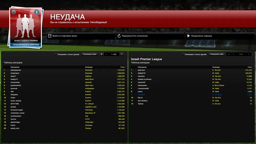 Еще одним нововведением Football Manager 2013 является так называемый режим испытаний. В нем можно обнаружить четыре различных сценария, каждый из которых предлагает той или иной вариант действий. В самом легком сценарии, к примеру, нужно постараться не упасть на последние места в турнирной таблице, а также решить проблемы, связанные с большим числом травмированных игроков. В самом сложном, в свою очередь, категорически запрещено прерывать беспроигрышную серию до конца сезона. Нужно отметить, что до победного конца в том или ином сценарии можно добратся достаточно быстро, но я завершал испытания еще быстрее: постоянно лажал, ошибался и в конце концов проигрывал. Ну не умею я руководить клубом, не мое это.