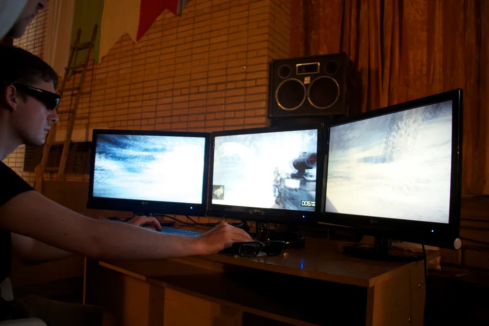Сотрудник Nvidia играет в Bad Company 2 на трёх мониторах (разрешение 5к на 1к) в 3D.