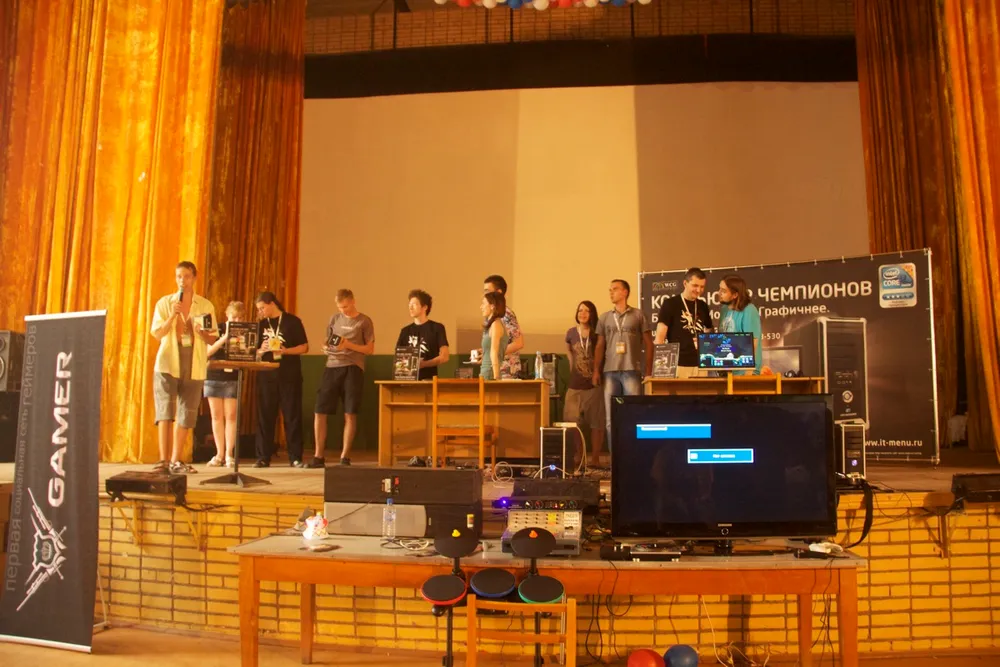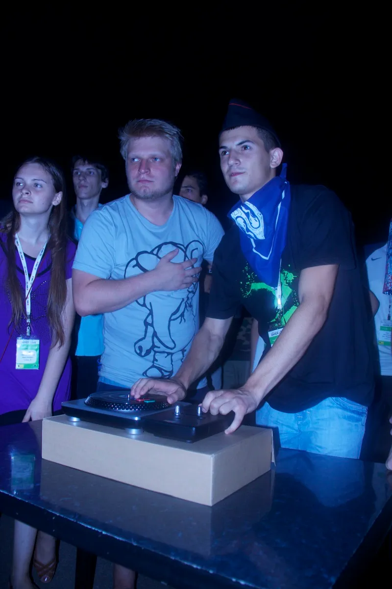 Виктор Зуев объявляет начало турнира по DJ Hero.