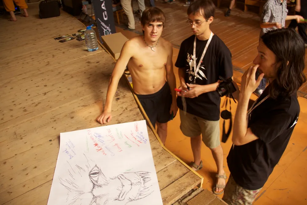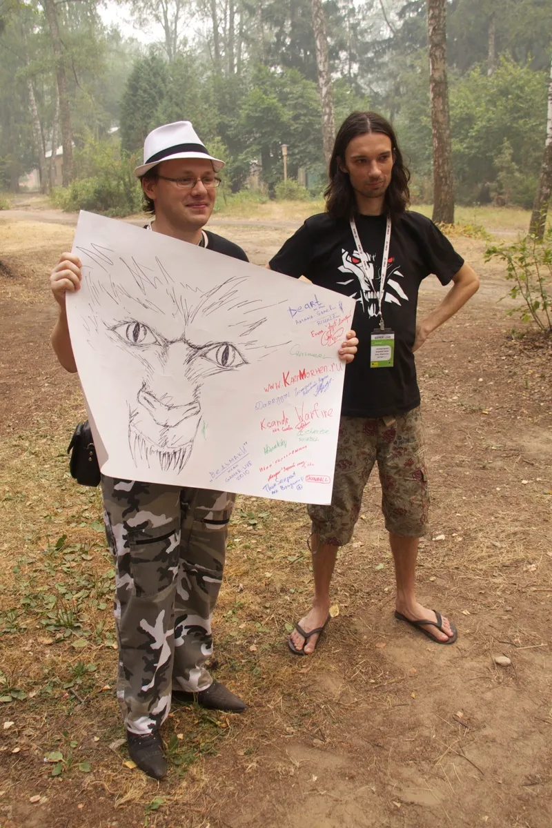 @Deart, @Ksandr_Warfire и Владимир из Сноуболла рядом с подписанным плакатом.