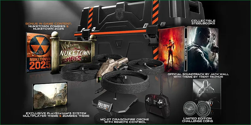 Как бы вы ни относились к «колде», не оценить мощь издания сложно. Помимо ставшего классикой стилбука со всякими саундтреками и дополнительным контентом создатели положили в черный ящик две металлические коллекционные медальки и главную фишку издания - радиоуправляемого дрона. Это вертушка, которая заряжается через USB и может летать по квартире, пугая вашу бабушку. Все это хранится в большом черном ящике, в котором без проблем можно запереть приставучего младшего братика. Издание в среднем стоит около 250 вечнозеленых. Но это фигня по сравнению с проблемой, куда убрать этот гигантский пластиковый саркофаг..
