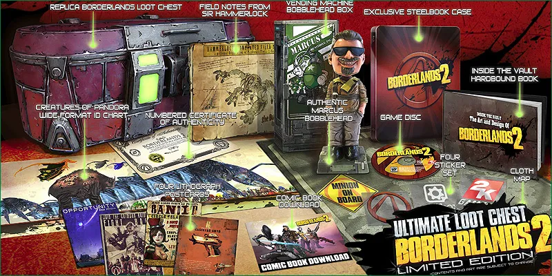 Если в силу ряда причин огромные коробки вас не пугают, рекомендую обратить свой взор на другой бокс по мотивам Borderlands 2: его нафаршировали начинкой под завязку. В ящике Пандоры вас ждут традиционный стилбук, допконтент, множество всякой полезной макулатуры (наклейки, путевые заметки, карта, артбук, литографии и прочие сертификаты), а также фигурка Маркуса, которая трясет башкой всем на радость. Поставляется этот комплект в фирменном сундуке, а цена вопроса упирается где-то в те же 250 енотов с вариациями, если не врет Ebay.