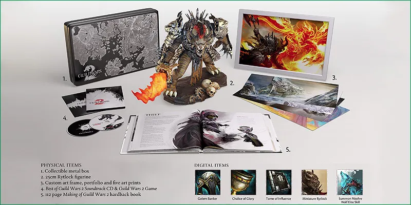 Хотя загружаемый контент - вещь, безусловно, приятная, многие коллекционеры от издания ждут более материальных фишек. Им памятник подавай, можно прям с конем. Особенно повод порадоваться нарисовался у поклонников Guild Wars 2: за уже более земную цену в 150 президентов они получили не только игру в стальном боксе со всякими дигитальными наворотами, артбуками и саундтреками, но и классную фигурку Ритлока ростом аж в 25 сантиметров. Фигурке стоит отдать должное: детализирована она на ура и на полке будет смотреться всяко интересней черных ящиков. За это и любима.