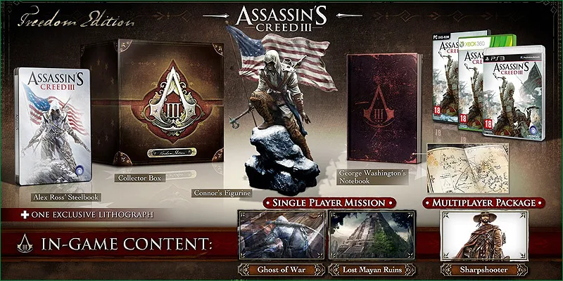 Аналогичный повод порадоваться был у поклонников ассасинов: Freedom Edition щеголяет не только дополнительными материалами и блокнотиками всяких Вашингтонов, но и симпатичной фигуркой Коннора, попирающего пятой кусок скалы. Капюшон, сползающий на глаза, сжатые губы, тяпка в руке и потомственный хронический сколиоз персонажа - все в лучших традициях серии. И детализация не подкачала. За 150 енотов Коннор может оказаться и на вашей полке.