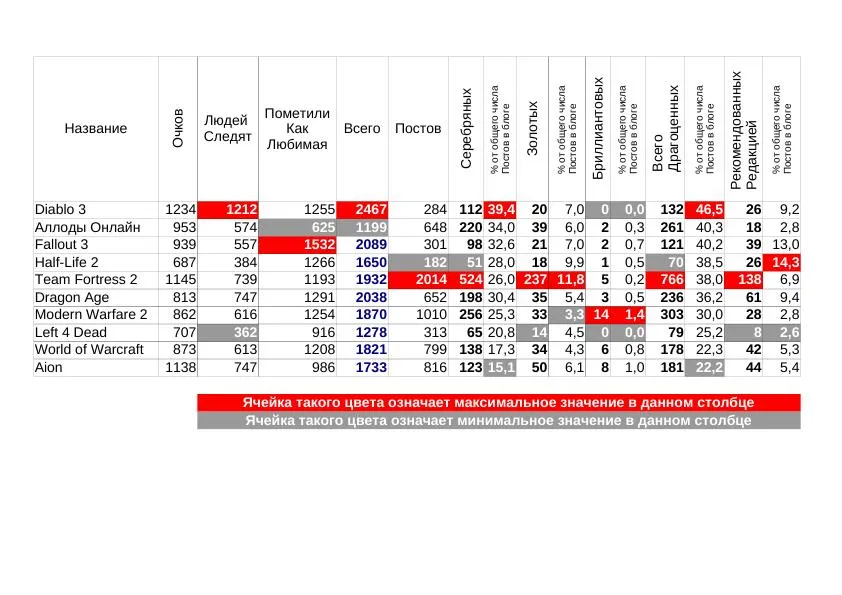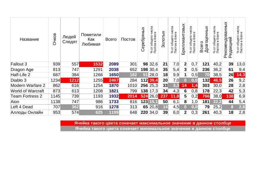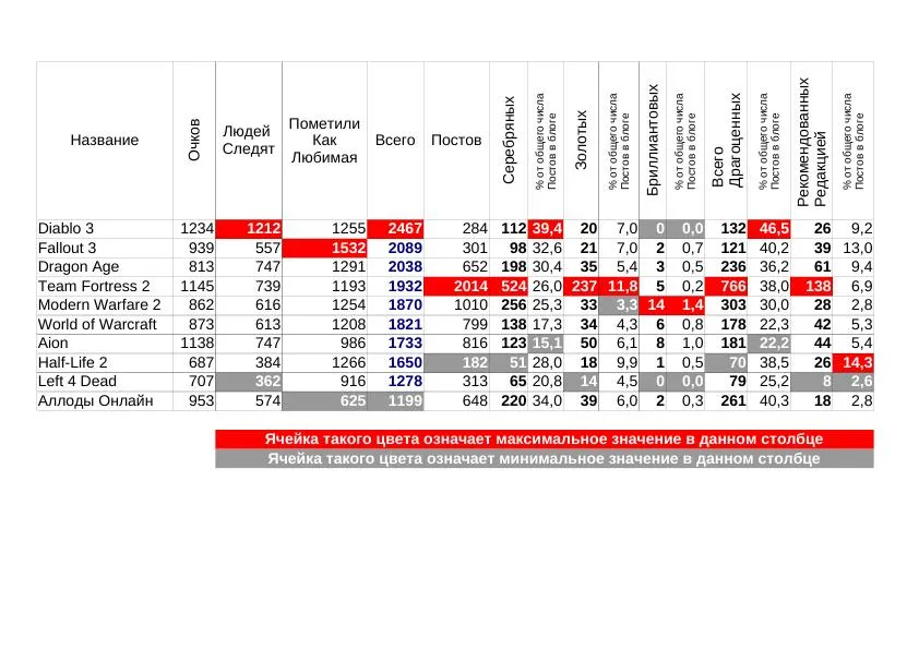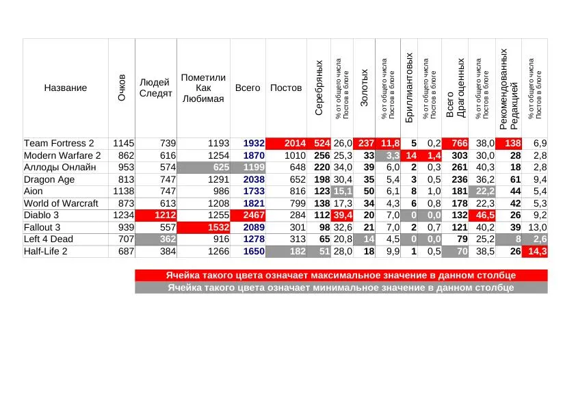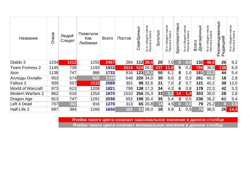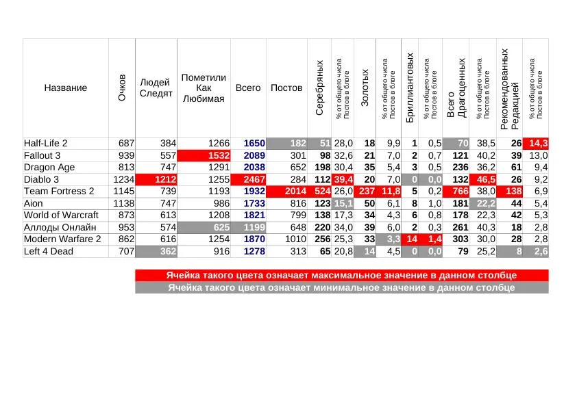 Самый последний в обычном топе Half-Life2 тут оказался самым первым и качественным. У него 14% постов рекомендовано редакцией. Второе место - Fallout 3, он отстал всего на 1 процент. Извините за назойливость, но Dragon Age тут третий. А лидер по общему числу медалек, Team Fortress - пятый.