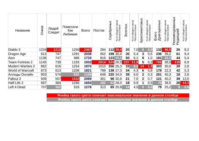 Diablo 3 опять на первом месте. Что ж, для невышедшей игры это просто замечательно. Аллоды на втором, Фоллаут 3 на третьем, а четвертое место занимает самый последний в обычном топе Half-Life2. Aion увы, тут самый последний. То есть постов много, а серебра-золота среди них мало, да.