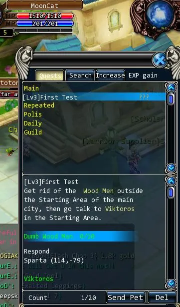 Первое что нам нужно при входе в игру - поговорить с наставником новичков. Жмем Q и в закладке "Search" выбираем единственный доступный квест: