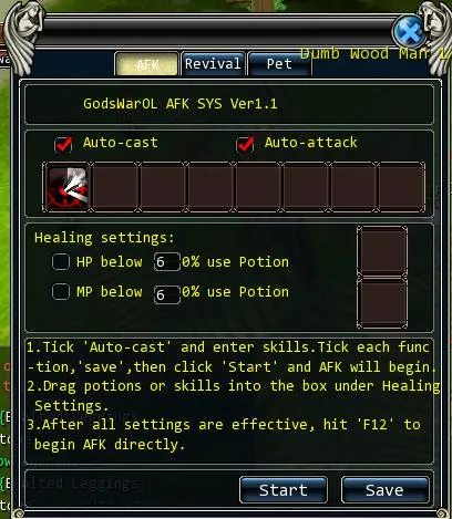 Кликаем по имени монстров в описании квеста и тем самым включаем автобег до места их обитания. Пока бежим открываем инвентарь и кликаем по мешочку новичка (иконка мешочка красного цвета). Получаем книгу с новым скилом и пачку усилителей экспы. Изучаем скилл, кушаем свиток двойной экспы. Самое время настроить нашего верного помошника - встроенную систему автоатаки. Вызываем панель автоатаки кликнув по изображению скрещеных мечей в нижней панели. Переносим имеющиеся у нас скилы, включаем опции автокаст и автоатака (если вы воин или чемпион и только каст если вы прист или маг. расположив скилы по своему усмотрению жмем кнопку Save и закрываем окно: