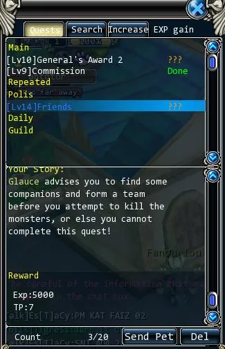 Продолжаем собирать задания из окна Search панели квестов (Q). На 14м уровне станет доступен очень вкусный (5000 экспы) квест Friends. Взять его можно только вступив в группу (скорее всего к этому времени Вы все еще будете находится в группе со своим учителем):