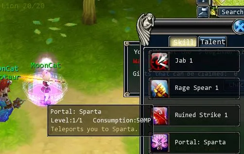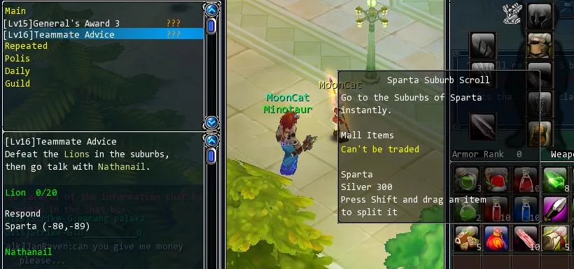 Получив 16 уровень берем задание на убийство львов (за него дадут крутую пушку!). Используем свиток телепортации в предместья спарты для более быстрого достижения цели. Оттуда бежим автобегом до монстров: