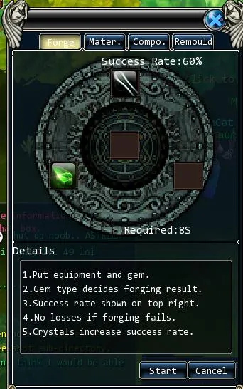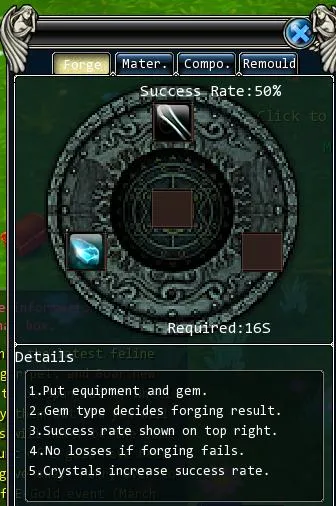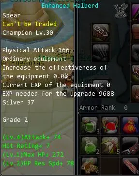 Снимаем оружие в инвентарь и нажатием правой клавиши мыши отправляем его в окно заточки. Этой же клавишей отправляем следом камешек зеленого цвета. Точим с 60% шансом до успешной заточки. Можно попробовать заточить еще на один грейд уже с шансом 30%. По такой же схеме точим синими камнями:
